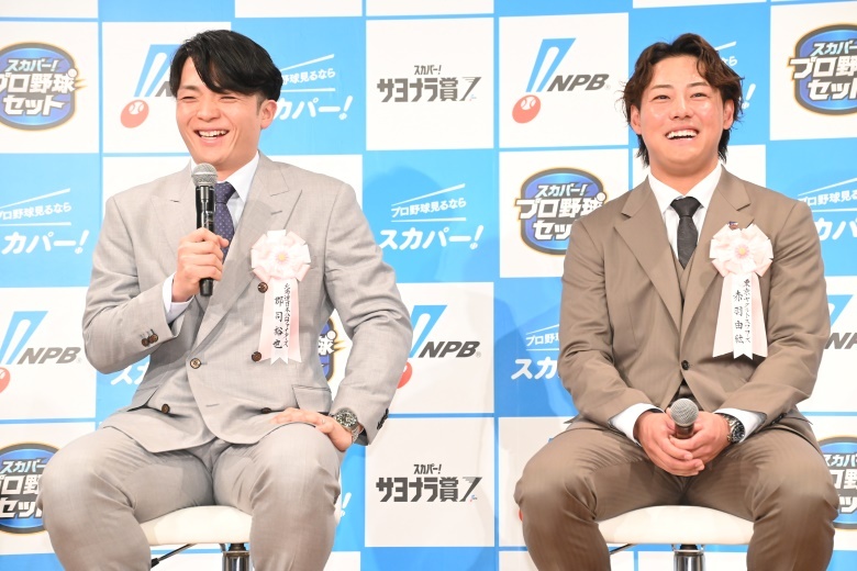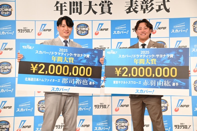 12月4日、「2025 スカパー!ドラマティック・サヨナラ賞 年間大賞」の表彰式が開催された。式典には、セ・リーグ受賞者の東京ヤクルトスワローズ・赤羽由紘選手、パ・リーグ受賞者の北海道日本ハムファイターズ・郡司裕也選手が登壇。表彰式後には、ゲストに中田翔氏、さらにスカパー!プロ野球アンバサダーのバッテリィズを迎え、トークショーも行われた。