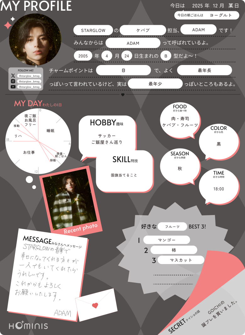 もっと知りたい! STARGLOWのプロフィール帳を大公開! ミュージシャン 2025.12.27 30 今回は、12月28日(日)に放送される「STARGLOW Special -Roots of the Glow-」を記念し、STARGROWのメンバーにプロフィール帳を書いてもらった。他では明らかにされていない5人のプライベートはファン必見! ■RUIのプロフィール帳 RUIのプロフィール帳 ■TAIKIのプロフィール帳 TAIKIのプロフィール帳 この記事の全ての画像を見る 次のページへ 1 2 1 2 もっと知りたい! 放送情報 STARGLOW Special -Roots of the Glow-放送日時:2025年12月28日(日)20:00~2026年1月30日(金)18:30~チャンネル:MTV