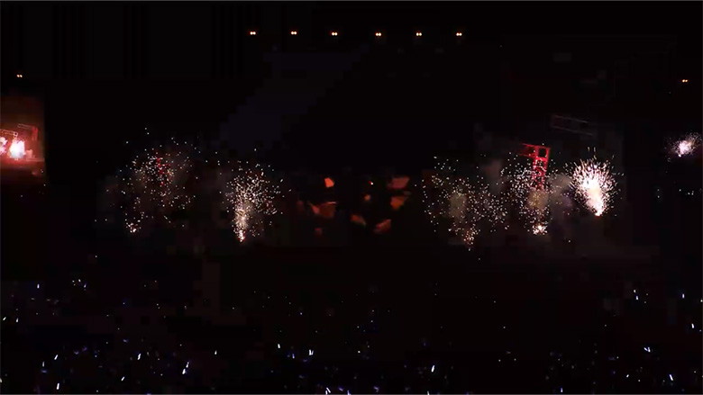 グッズの紹介をしていると、黒ずくめの怪人「ヤクザ」たち(?)が登場。彼らをぶっ飛ばすべく「フメツフハイ」が披露されるとファンたちの身につけた愛あるグッズが宙を舞い、加賀美に力を与えていく。しかし、応援虚しく怪人により爆発が起こってしまう。その最中、爆風により加賀美の髪型がチェンジ。ファンからはカッコよさに悲鳴のような歓声があがり、それに後押しされるかのように炎の演出と共に加賀美はこの曲も走り抜けた。