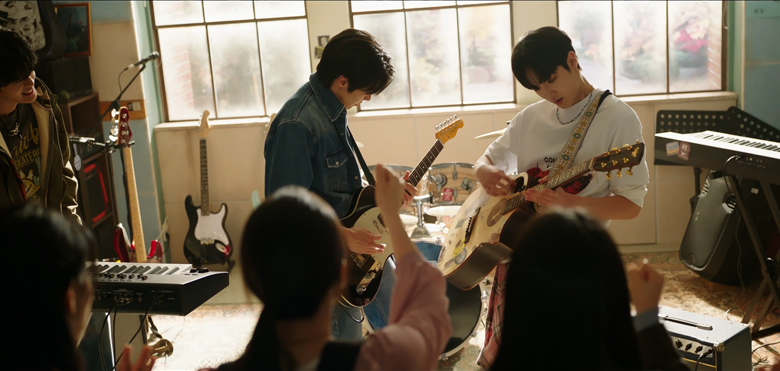 また、劇中では、N.Flyingのボーカル&ラップ&ギター担当であるイ・スンヒョプとの演奏シーンも必見だ。新人とは思えない堂々としたパフォーマンスを見せるユジュンと、「ソンジェ背負って走れ」(2024年)など俳優としても躍動するスンヒョプの共演は、両者のファンにとって垂涎もの。確かなスキルに裏打ちされた、FNCバンドのフロントマンたる所以を改めて証明する場面となっている。