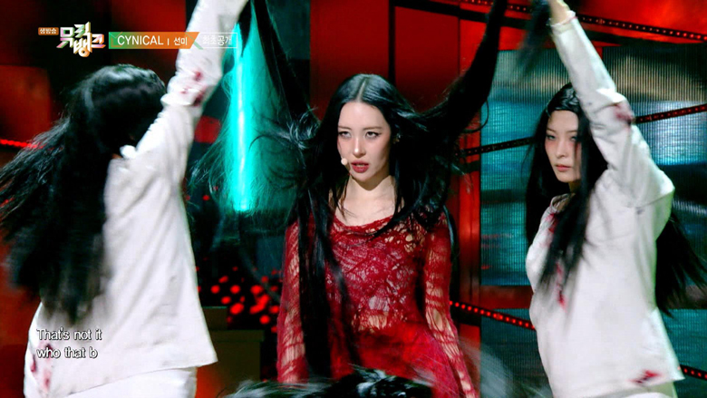 床に倒れ込んだ"マンネ(末っ子)"のMAKI(マキ)がメンバーに担がれながら再び立ち上がる歌い出しをはじめ、壮大なストーリーを想起させる力強い群舞――パフォーマンスリーダーとしてグループを牽引するK(ケイ)を中心に、9人が次々と入れ替わりながら畳み掛けていく構成、さらに楽曲のメッセージを体現する表情や緩急をつけた動きまで、まるで舞台芸術を見ているかのようだ。