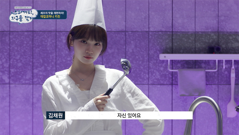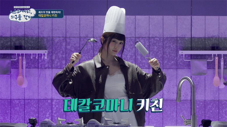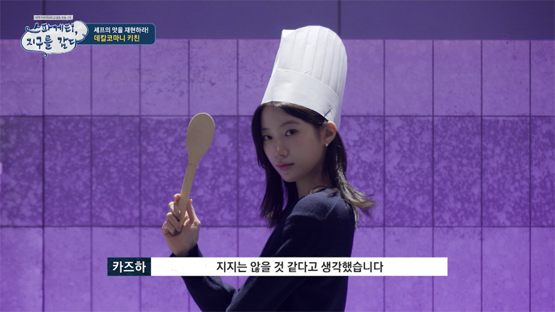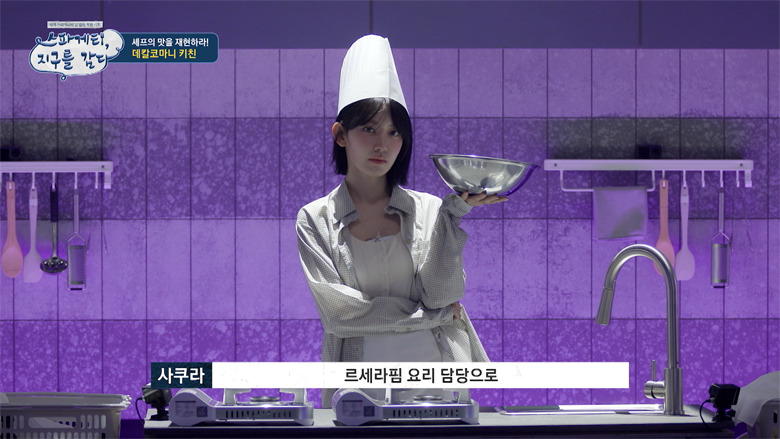 例えば、番組序盤は予約が超困難な人気スパゲッティ店にKIM CHAEWON(キム・チェウォン)とHONG EUNCHAE(ホン・ウンチェ)がレポートに訪れるという寸劇から幕開け。2人がやたらと女性の気を引こうとする"フラーティング魔"のスタッフに翻弄させられていると、途中からその弟分らしきウェイターとしてKAZUHA(カズハ)、バイトの面接にやってきたHUH YUNJIN(ホ・ユンジン)、デリバリーの配達員に扮するSAKURA(サクラ)が続々と来店。困惑をこらえきれないCHAEWONとEUNCHAEのリアクションも見ていて可笑しく、ゆるーくシュールな笑いが繰り広げられていく。