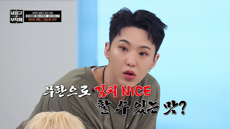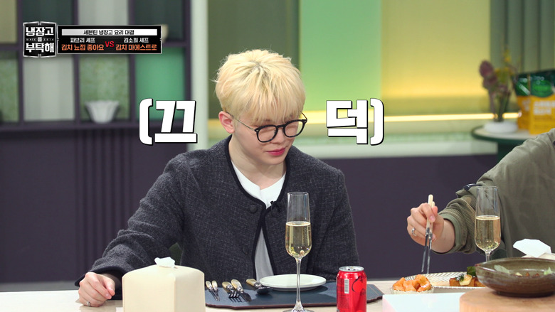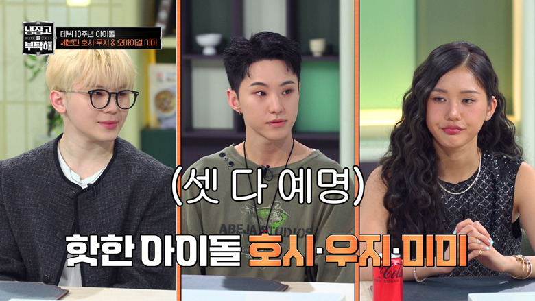 「お2人ですが冷蔵庫は1つですね」とMCが指摘すると、「別々に住んでいるんですが、今日は(中身を1つに)合わせてきました」(ホシ)、「食材が別々に持ってくるほど多くないので...」(ウジ)と、番組への配慮だった模様。気の置けない親友同士だからこそ可能な気遣いに、もう一人のゲストであるOH MY GIRLのMIMI(ミミ)も、セブチのライブの定番曲「VERY NICE」の歌詞に引っ掛けて「アジュ(VERY) NICE!」と納得の表情を見せる。