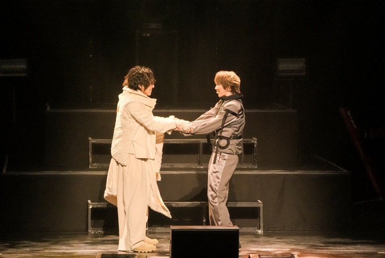 幕開けを飾ったのは、アオ(蒼井翔太)とウミ(七海ひろき)の出会いを描いた演劇パートだ。砂漠化が進む地の星で花を研究する青年と、不慮の事故にあった宇宙船の乗組員である青年。孤独を抱えた2人が通信を通じて心を通わせる様子は、シンプルな会話劇ながらも、歌が差し込まれることで一気に世界が広がっていく。