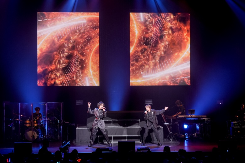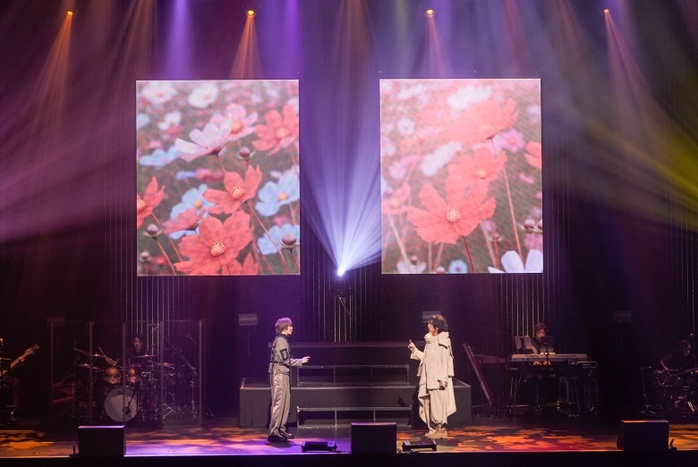 最初に披露されたのは「CosmoS」。ステージの両端に立つ2人が、それぞれの場所から放つ歌声を重ね合わせた瞬間、客席は息を呑む。スクリーンに映し出される宇宙の映像と生バンドの演奏が相まって、まるで自分自身もその通信に立ち会っているような没入感に包まれた。続いて披露されたのは「Stella」。互いに手を伸ばし合い、最後には腕をクロスさせる振り付けが加わることで、奇跡の出会いを歌う歌詞が立体的に浮かび上がってくる。歌い終えた瞬間、会場を包んだ拍手は2人の友情を祝福するようだった。さらに「砂漠の花」では、軽やかで希望に満ちたハーモニーが響き渡る。スクリーンには花々が咲き誇り、その映像と歌声が呼応するかのように、楽曲が現実を変えていく力をまざまざと感じさせる。終盤で自然と客席から漏れたどよめきは、その瞬間を確かに共有していた証だった。