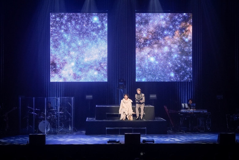 幕開けを飾ったのは、アオ(蒼井翔太)とウミ(七海ひろき)の出会いを描いた演劇パートだ。砂漠化が進む地の星で花を研究する青年と、不慮の事故にあった宇宙船の乗組員である青年。孤独を抱えた2人が通信を通じて心を通わせる様子は、シンプルな会話劇ながらも、歌が差し込まれることで一気に世界が広がっていく。