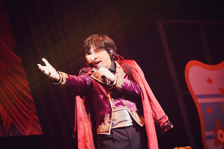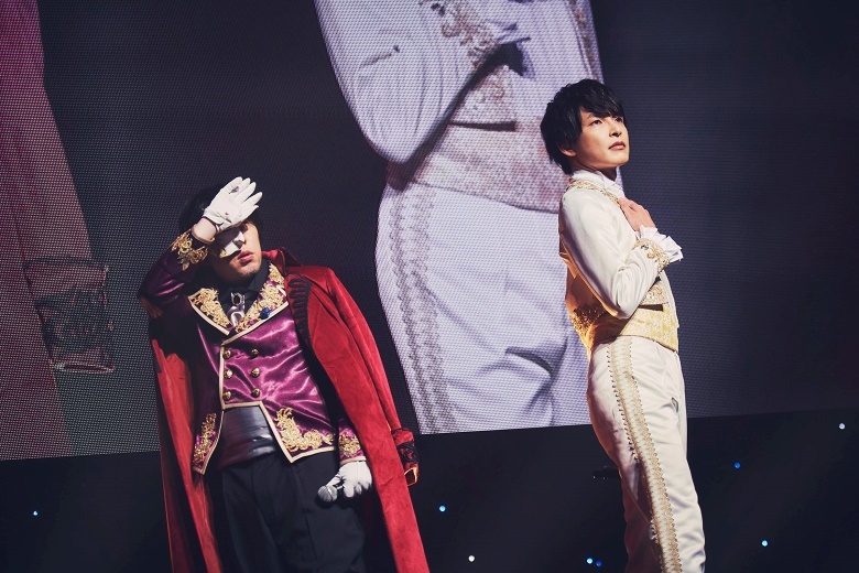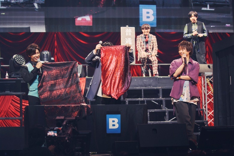続く「真のジェントルマンのためのエレガントテストParty!」は、AとBの二択から"エレガント"な方を見極める格付けチェック形式。観客も札を掲げて参加できるのが面白い。さらに春組リーダー・佐久間咲也役の酒井広大がサプライズ登場すると、会場は大歓声に包まれた。