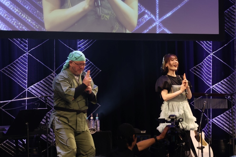 オープニング早々に行われた恒例のカラオケコーナーでは、花澤がおもむろにサングラスをかけてスタンバイ。選曲は、アニメ「NARUTO」の主題歌として知られるFLOWの「GO!!!」。忍者のテーマにぴったりの一曲を力強く歌い上げ、会場のボルテージは一気に最高潮へと引き上げられた。